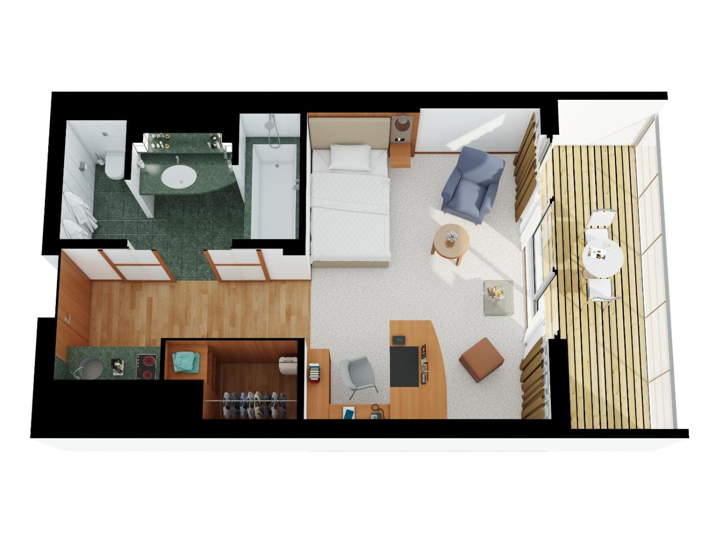 Studio. Dieses Studio verfügt über einen kombinierten Wohn- und Schlafbereich, eine Küchenzeile, einen Flachbild-TV, einen begehbaren Kleiderschrank sowie ein eigenes Bad mit einer Badewanne. Dieses Studio bietet Blick auf den Potsdamer Platz und das Sony Center. ;