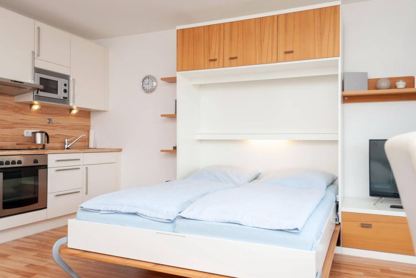 Diese Ferienwohnung bietet einen Balkon, ein Wohnzimmer und einen Flachbild-TV. Die Küche ist versehen mit einem Kühlschrank und einem Geschirrspüler, einem Ofen sowie einer Kaffeemaschine und einem Wasserkocher.