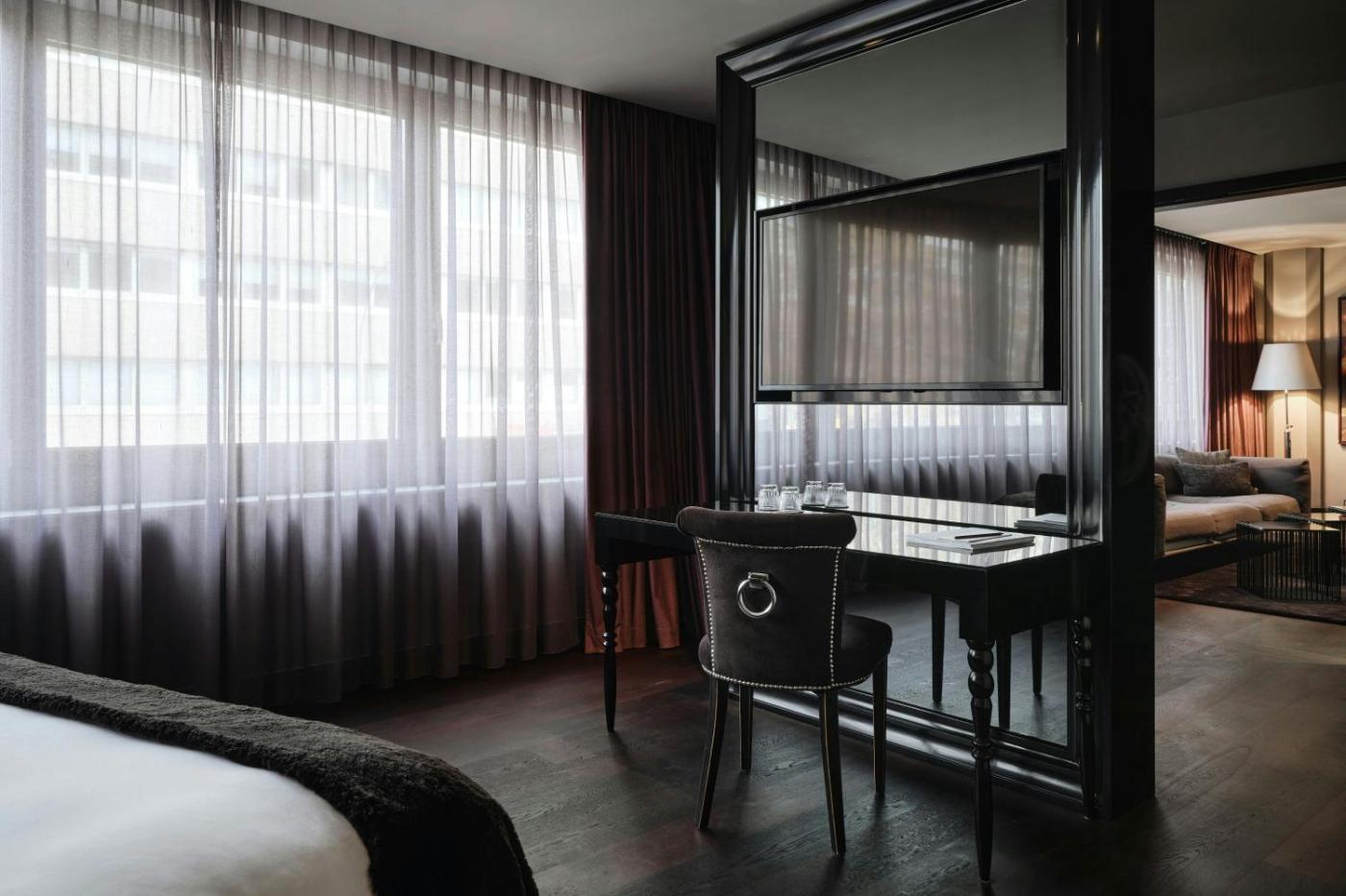 Die stilvollen Zimmer im Roomers Frankfurt Central, Autograph Collection sind mit dunklen Holzmöbeln eingerichtet und in warmen Farben gehalten. Alle Zimmer verfügen über ein Marmorbad, eine Bluetooth-Soundbox und einen Flachbild-TV mit Sky-Kanälen.