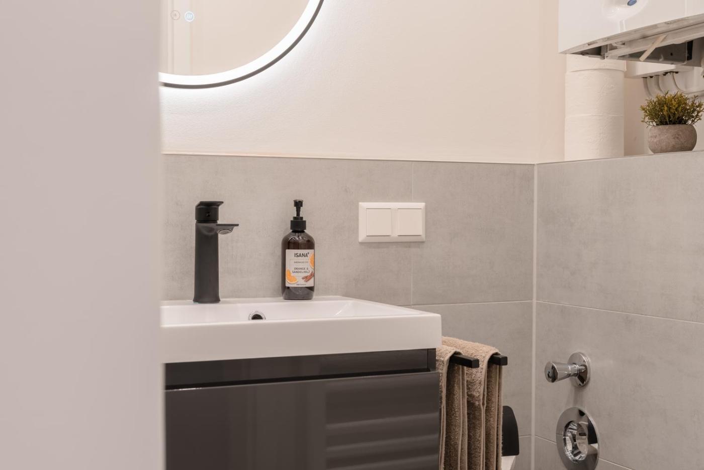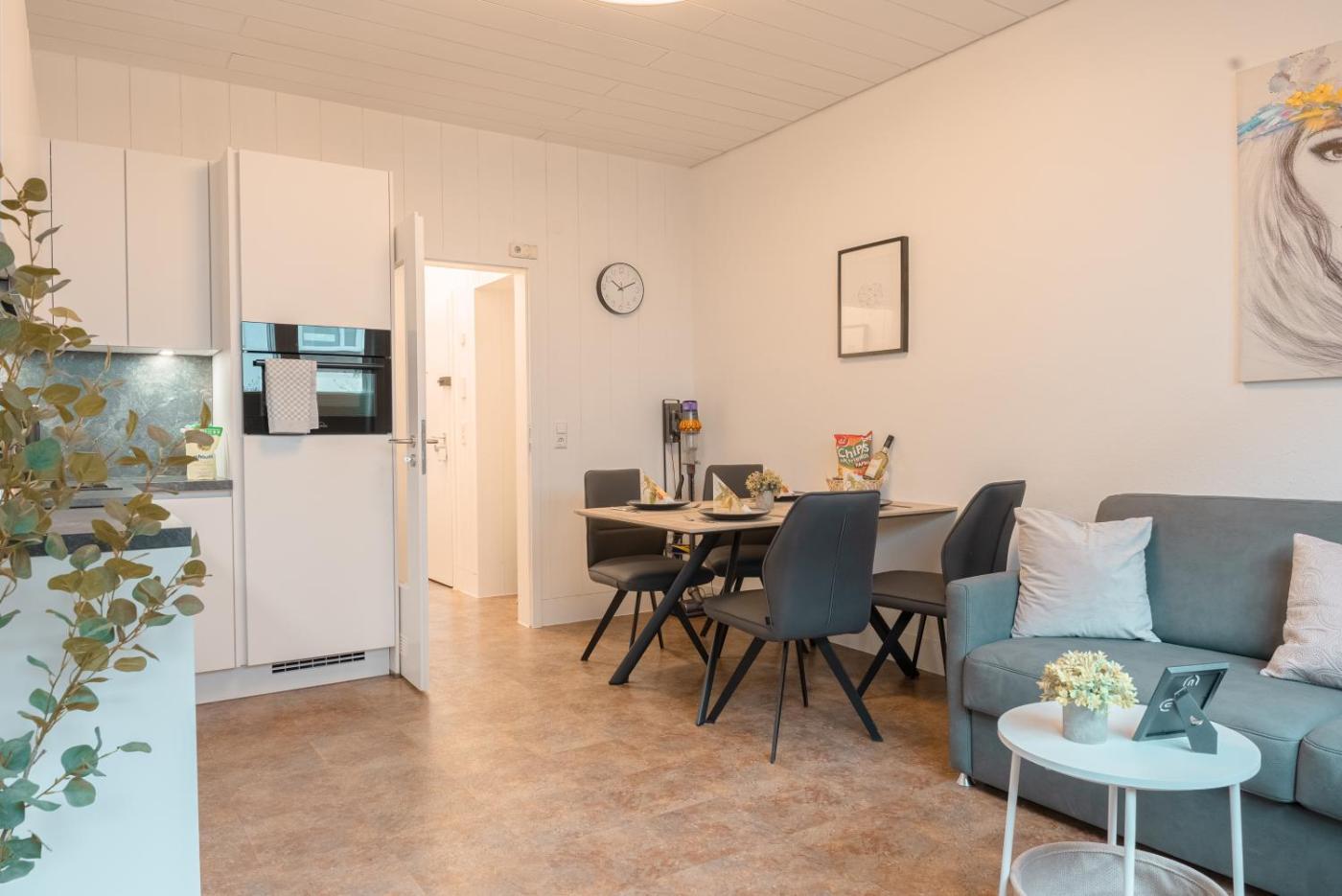 Apartment mit 1 Schlafzimmer. This apartment features 1 living room, 1 separate bedroom and 1 bathroom with a walk-in shower and free toiletries. The well-equipped kitchen features a refrigerator, a dishwasher, kitchenware and an oven. This apartment has a washing machine, flat-screen TV with streaming services, garden views, as well as winechampagne for guests. The unit has 2 beds.