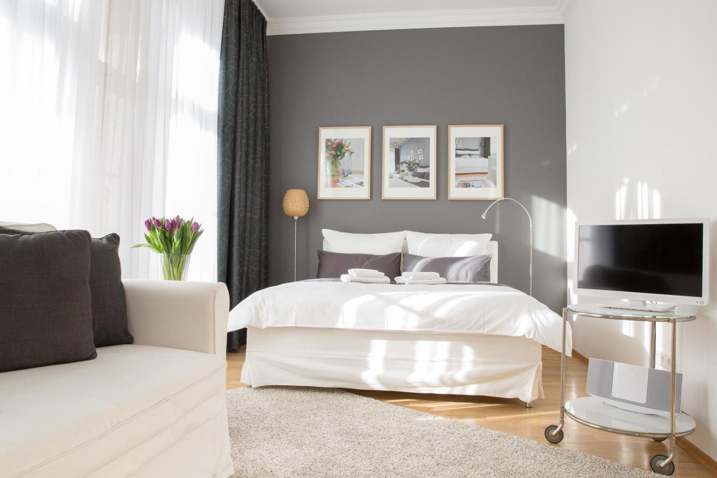 Studio-Apartment - Riemannstr. 54.1. Dieses moderne Apartment erwartet Sie mit einer voll ausgestatteten Küche und einem schicken Interieur. Freuen Sie sich auf einen Smart-TV, kostenloses WLAN und einen Luftreiniger mit Ventilator. Hier wohnen Sie nur 5 Gehminuten vom Stadtzentrum entfernt. Ein Aufzug ist ebenfalls vorhanden. Zusätzliche Gäste können in dieser Zimmerkategorie auch auf einem Schlafsofa übernachten. ;