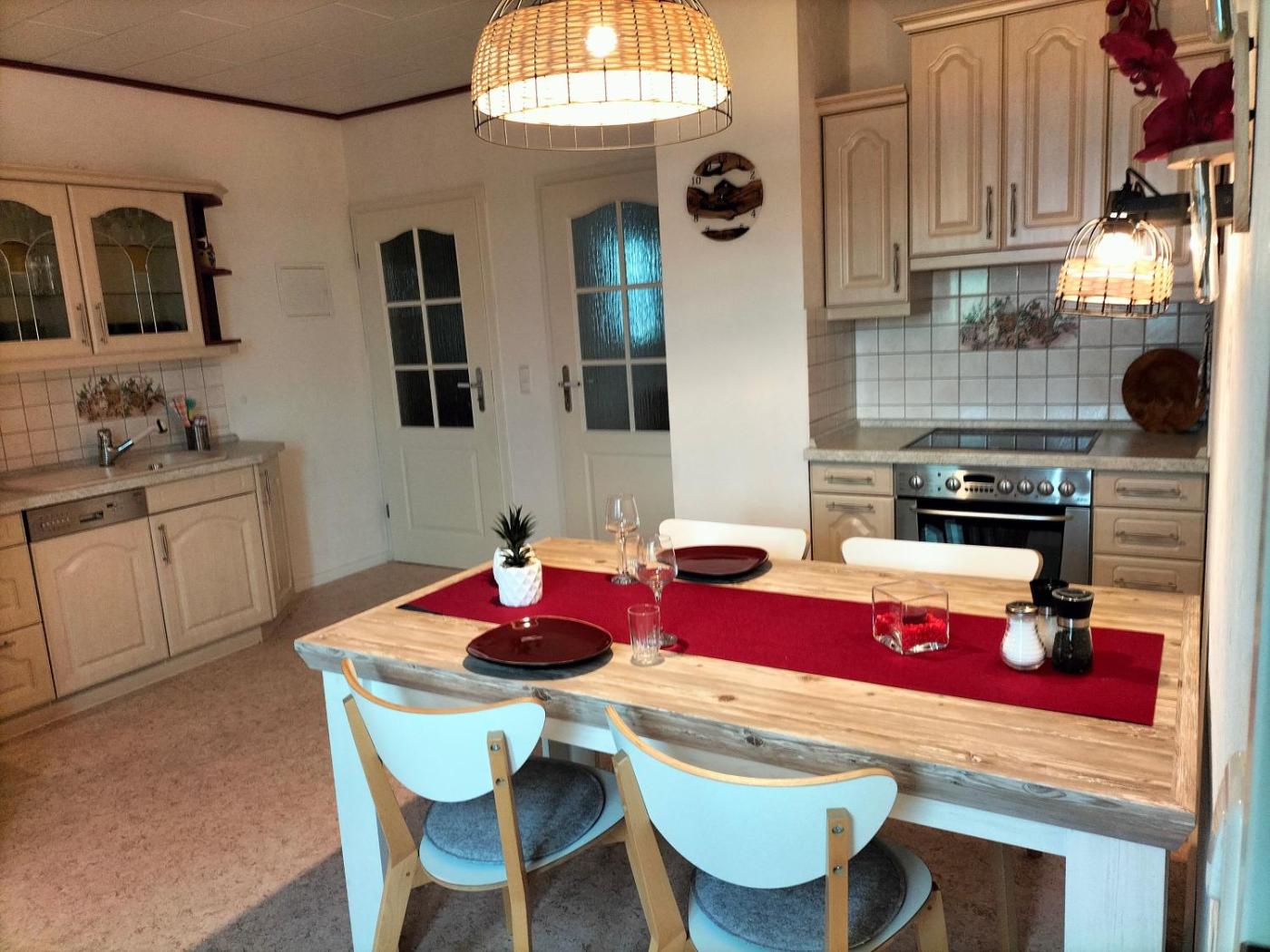 Die Küche ist eingerichtet mit einem Kühlschrank und einem Geschirrspüler, einem Ofen sowie einer Kaffeemaschine und einem Wasserkocher.