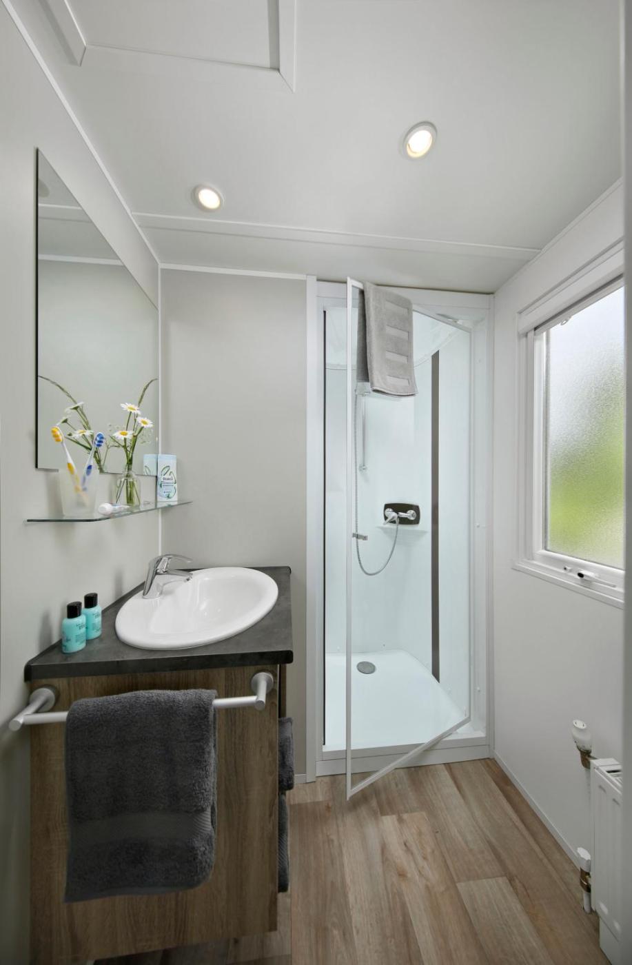 Mobilheim Luna. This mobile home consists of 1 living room, 2 separate bedrooms and 2 bathrooms with a shower. The well-equipped kitchenette features a stovetop, a refrigerator, kitchenware and a microwave. Featuring a patio, this mobile home also provides a coffee machine, a seating area and a TV. The unit offers 3 beds. ;