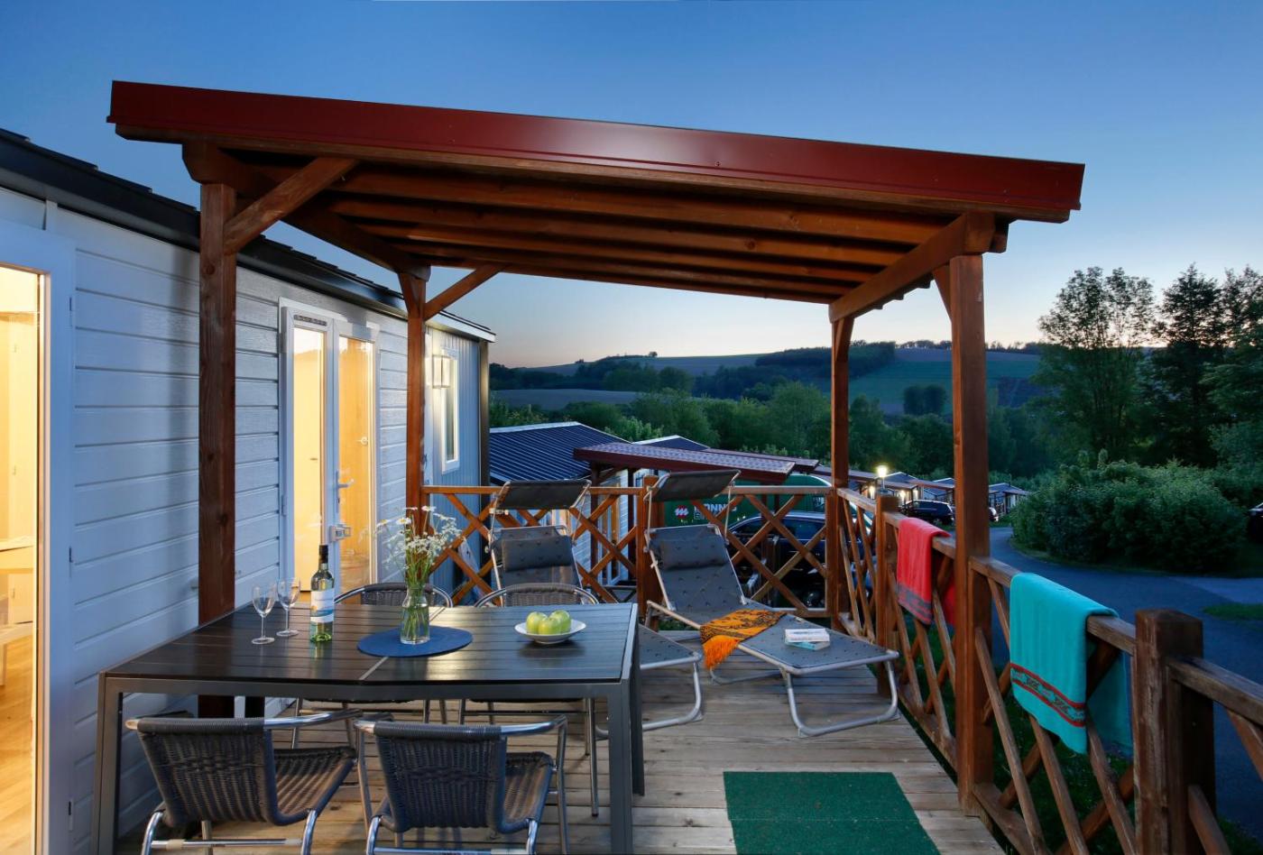 Mobilheim Jupiter. This mobile home includes 4 living rooms, 3 separate bedrooms and 2 bathrooms with a shower. The fully equipped kitchenette has a stovetop, a refrigerator, kitchenware and a microwave. A seating area with a TV, a coffee machine and a patio are offered in this mobile home. The unit has 5 beds. ;