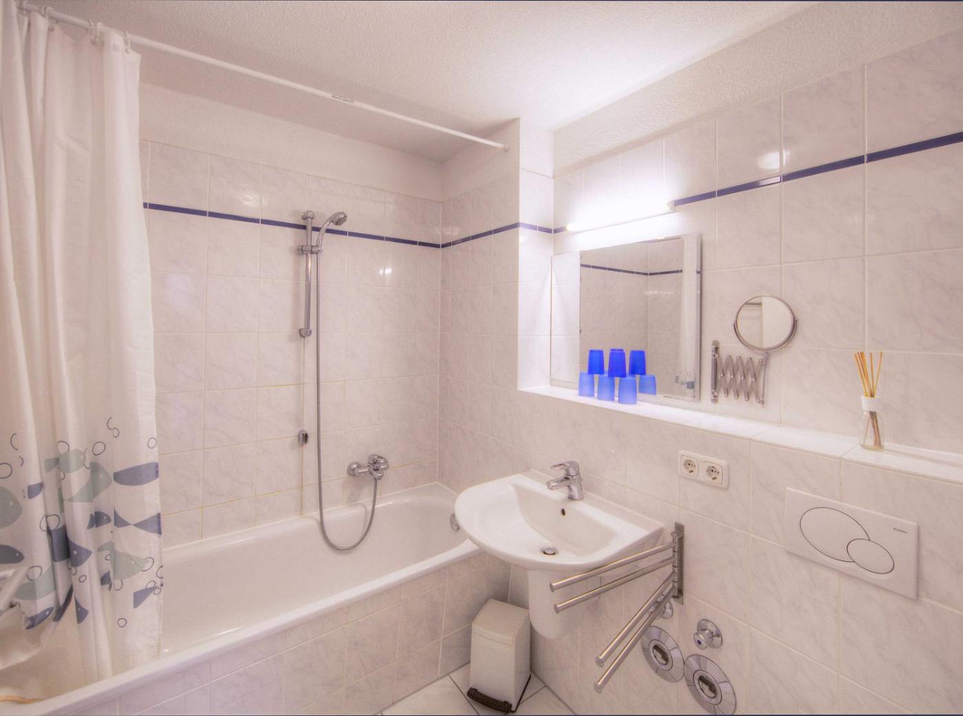Apartment mit Terrasse. This apartment consists of 1 living room, 1 separate bedroom and 1 bathroom with a bath and a shower. Guests can make meals in the kitchen that is equipped with a stovetop, a refrigerator, a dishwasher and kitchenware. This apartment features a coffee machine, a seating area, a TV with cable channels and a terrace. The unit offers 2 beds.