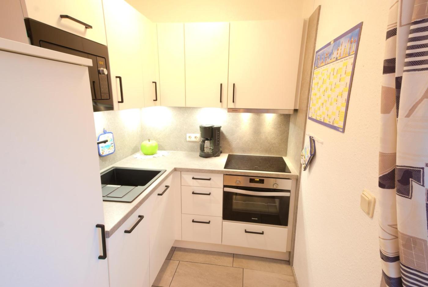 Apartment mit Balkon. The apartment has 2 bedrooms, 1 bathroom, a kitchen and a seating area. Guests will find a stovetop, a refrigerator, a dishwasher and kitchenware in the fully equipped kitchen. The apartment also includes a barbecue. Boasting a balcony with garden views, this apartment also features a washing machine and a TV. The unit has 3 beds.