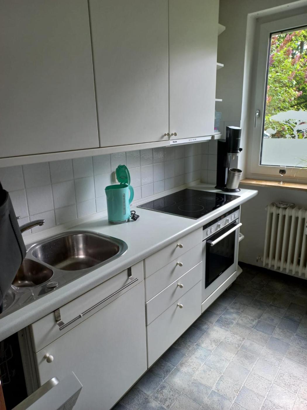 Die Küche ist versehen mit einem Kühlschrank und einem Geschirrspüler, einem Ofen sowie einer Kaffeemaschine und einem Wasserkocher.