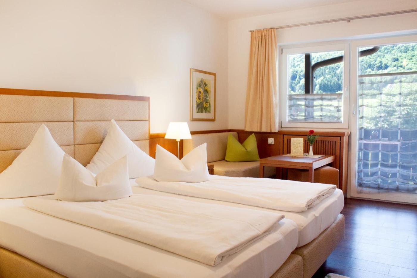 Auf dem Balkon einiger Zimmer befindet sich eine eigene Sauna (Suite, Familienzimmer, eines der beiden Apartments mit Bergblick). Die Sauna kostet EUR 18 pro Tag.