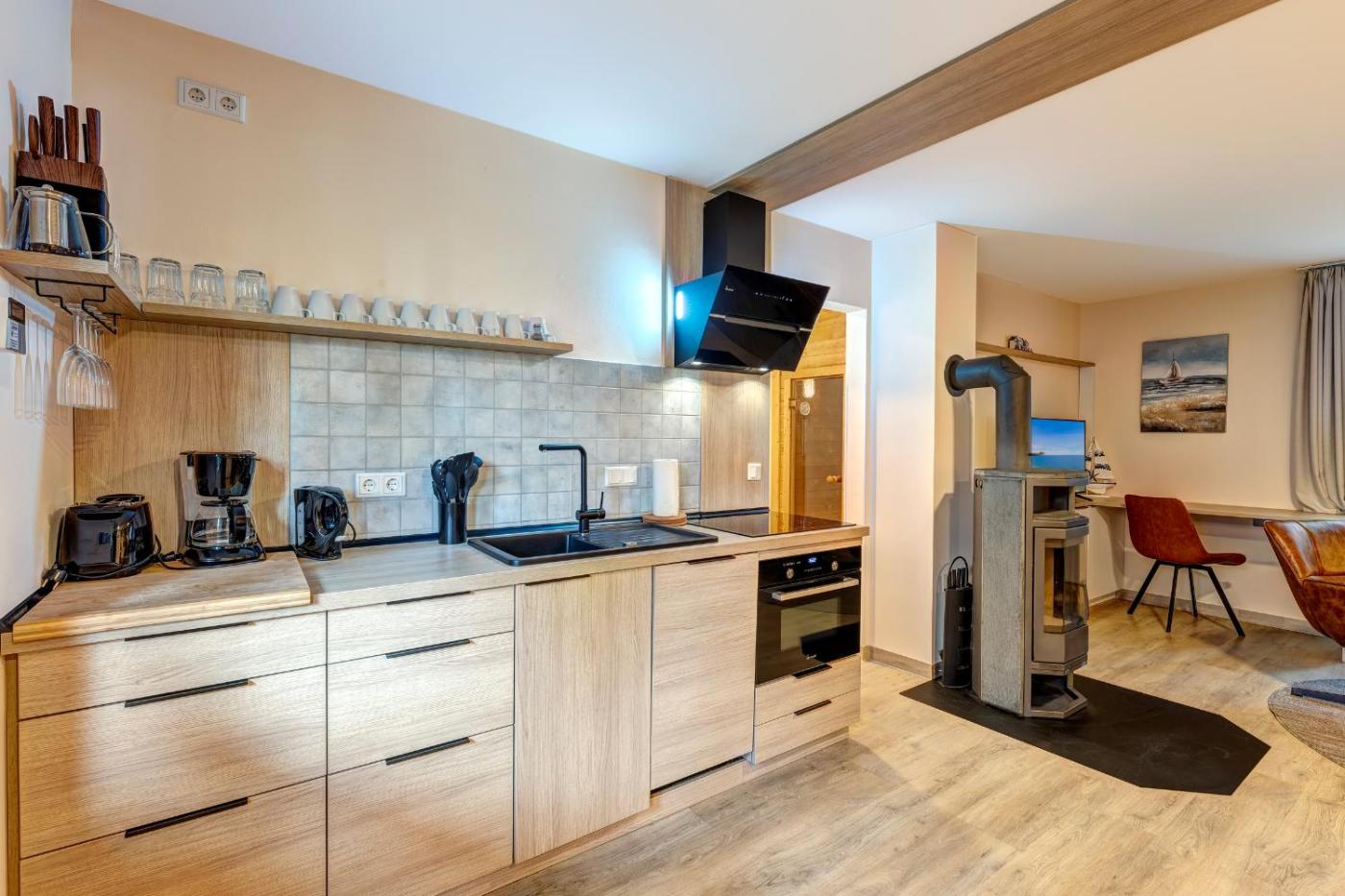 Superior Apartment mit Sauna. Guests will have a special experience as the apartment offers a fireplace. This spacious apartment consists of 1 living room, 2 separate bedrooms and 1 bathroom with a shower and free toiletries. Meals can be prepared in the kitchen, which is equipped with a stovetop, a refrigerator, a dishwasher and kitchenware. Featuring a terrace, this apartment also provides a coffee machine, a seating area and a TV. The unit offers 3 beds.