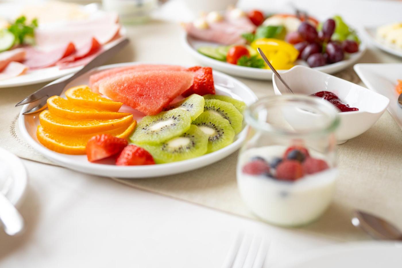Morgens stärken Sie sich im Landhaus an einem Frühstücksbuffet. Eine lokale Bäckerei liefert frische Backwaren.